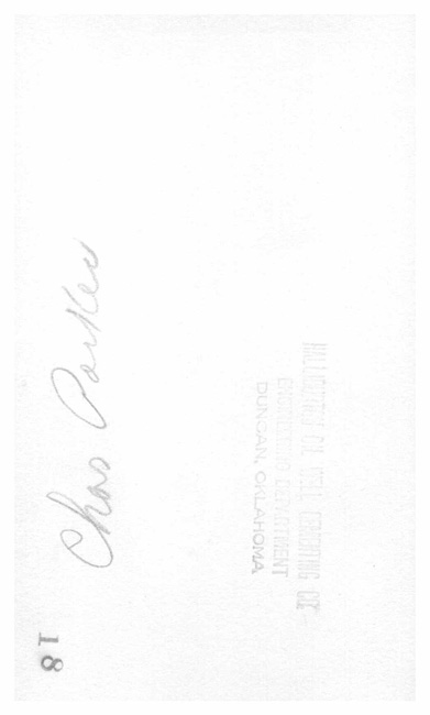 Notes:Back reads: Chas Parker Stamped: Halliburton Oil Well Cementing Co. Engeering Dept. Duncan, Oklahoma also stamped with 18 we have 2 of same photo
