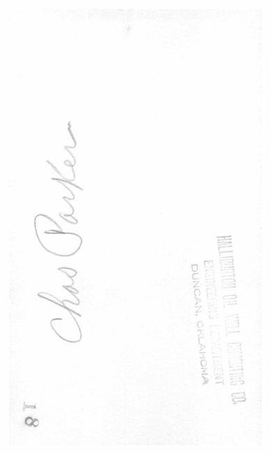 Notes:Back reads: Chas Parker Stamped: Halliburton Oil Well Cementing Co. Engeering Dept. Duncan, Oklahoma also stamped with 18 we have 2 of same photo