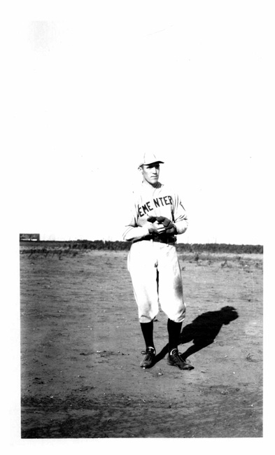 Notes: John Halliburton standing with glove and ball. Back reads John Halliburton, S.S. 2nd Base Duncan, Okla. 1928 stamped: Halliburon Oil Well Cementing Co. Engeering Department Duncan, Oklahoma