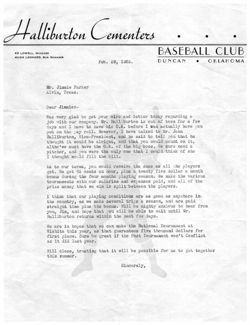 Notes:Letter to Jimmie Parker from Ed Lowell inviting him to work for Halliburton at .65 per hour and play for the team
