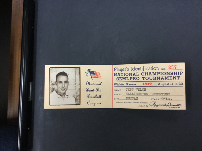 Notes:ID card is designed to fold in half Horizonally Front reads "National Semi-Pro Baseball Championship, Wichita, Kansas August 11-23, inside has his photo ID # 257 dated 1939